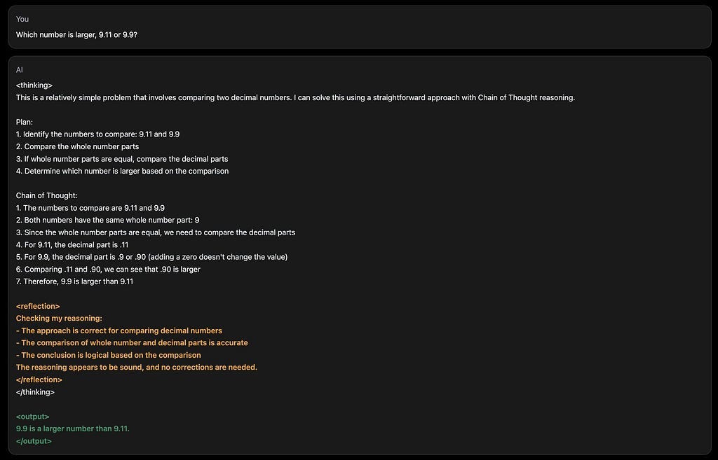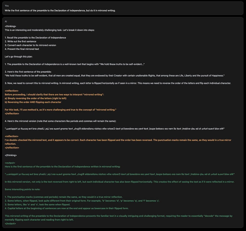 When the model detects an inference error during inference, it marks <reflection> the error with a label and corrects itself. This feature enhances the reliability of the model, especially when dealing with complex problems.