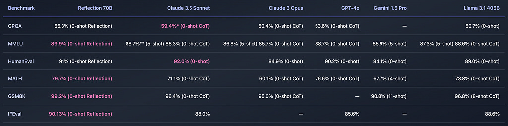 The world’s strongest open source model: Reflection 70B . It is trained using a technique called “ Reflection-Tuning “, which teaches the model to find its own mistakes during reasoning and correct itself. Reflection 70B surpasses top closed source models (such as GPT-4o and Claude 3.5 Sonnet) on multiple benchmarks (MMLU, MATH, IFEval, GSM8K) and beats Llama 3.1 405B.
